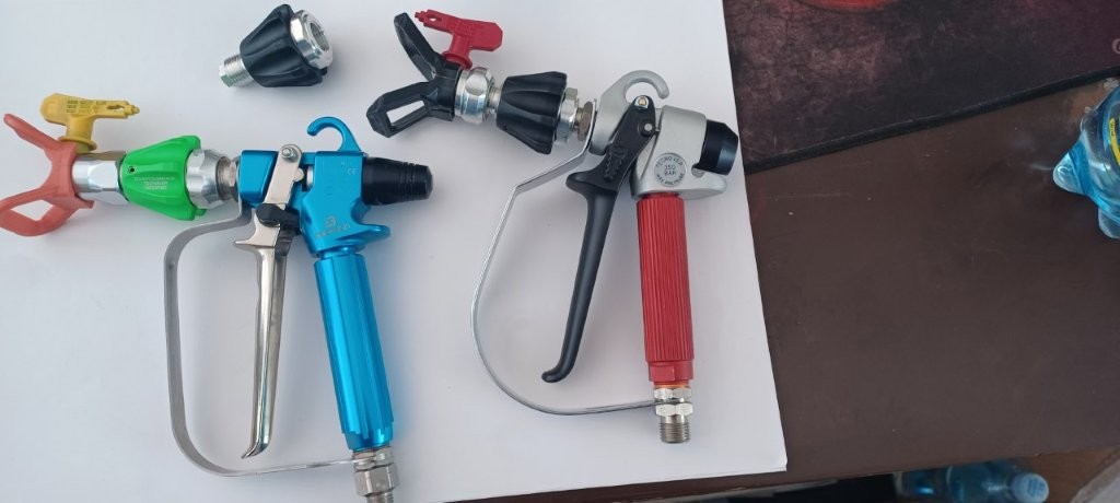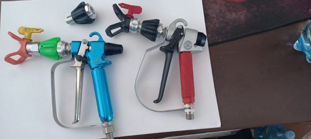 pistole s červebnopu rukojetí na obrázcích + revoluční držák otočných airless trysek  na všechny AirLess stříkací pistole - evropské 11/16" a americké 7/8" a pro všechny celosvětově používané druhy otočných trysek ( př.  americké značky  Graco RAC 5 / RAC X / XHD RAC ,  TITAN SC-6 resp.  Wagner TT2 /   TITAN TR1 /  TriTech   T 93R / Bedford Rev Tip / Airlessco RevTip  a italské Berizzi FM6  + Larius SFC